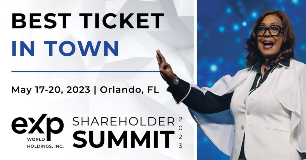 Want a deal? Then you need to act fast. If you are planning on attending the eXp Shareholder Summit in Orlando on May 17-20, 2023, you need to buy an early bird general admission ticket NOW. The price is $649 (USD) – a savings of $250 off the standard price of $899. But quantities are limited. The deadline to get this low price is Jan. 31, 2023, unless tickets sell out sooner!